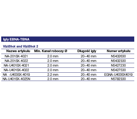 Olympus jest unikalny jeśli chodzi o ofertę zawierającą oprócz igieł 21G, 22G i 25G również igłę 19G EBUS-TBNA. Ale teraz oferuje również drugą generację igieł EBUS - ViziShot 2. Podczas gdy całe portfolio oferuje już sprawdzone mechanizmy bezpieczeństwa i doskonałą widoczność ultradźwiękową, Olympus zapewnia teraz igły na każdą sytuację - rozszerzając Twoje możliwości w EBUS-TBNA.