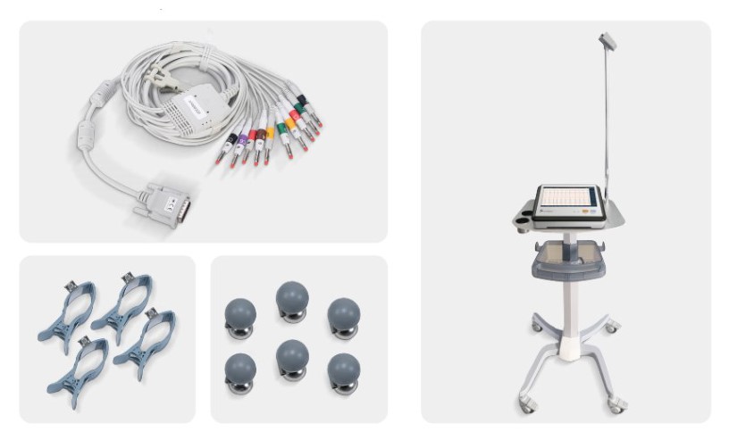 - Dostępne są również opcjonalne akcesoria, takie jak wózek EKG, który może ułatwić transport i przechowywanie urządzenia.