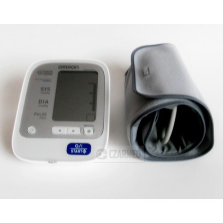 Ciśnieniomierz Omron M6 to w pełni automatyczny elektroniczny ciśnieniomierz naramienny wykonujący pomiar metodą oscylometryczną. Posiada niezastąpioną technologię wykrywania nieregularnego bicia serca. Duży czytelny wyświetlacz pozwala z łatwością odczytać wyniki pomiaru. Urządzenie posiada możliwość zapamiętania po 100 pomiarów dla 2 osób. W zestawie z ciśnieniomierzem mankiet (22 - 42 cm). Model omron m6 posiada charakterystyczny, innowacyjny mankiet twardy z technologią czujników 360 stopni, dzięki którym użytkownik nie musi dłużej martwić się o to czy rurka powietrzna jest ułożona w odpowiednim miejscu. Ciśnieniomierz jest wyposażony w funkcję wykrywania nieregularnego bicia serca. Posiada również możliwość połączenia i przesyłania danych komputera lub smartfona. Posiada również możliwość połączenia i przesyłania danych do komputera lub smartfona. Posiada wskaźnik informujący czy otrzymany wynik pomiaru mieści się w przyjętych normach. Jego dodatkową zaletą jest funkcja wykrywania ruchu użytkownika w trakcie pomiaru.
