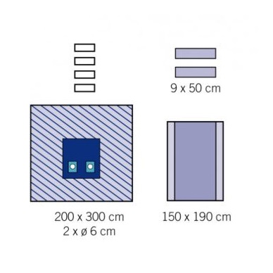 - 1 serweta do obustronnej operacji kończyn 230 x 300cm, 2 elastyczne otwory Ø 6cm z warstwą chłonną 50x 100cm z organizatorami przewodów