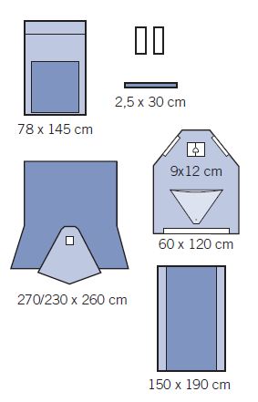 • 1 serweta ginekologiczna 270 / 230 x 260 cm, przesłona 24 x 21 cm z zintegrowanymi nogawicami,