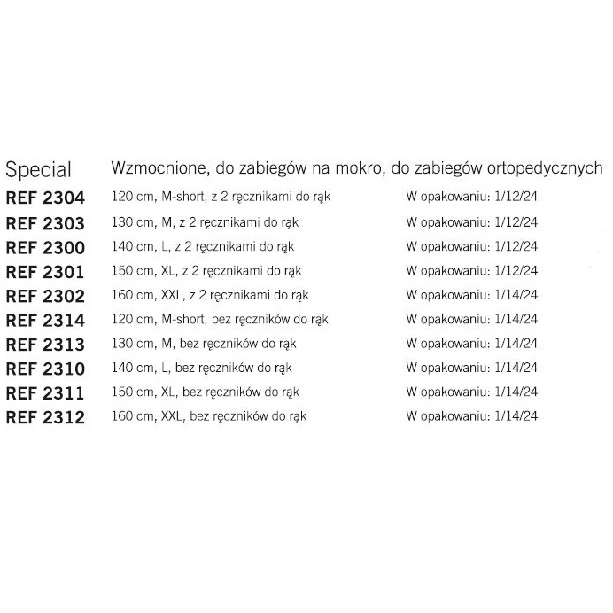 Fartuchy chirurgiczne, wzmocnione, do zabiegów na sucho. Wykonane z włókniny Spunlace. Przeznaczenie głównie do zabiegów ortopedycznych.