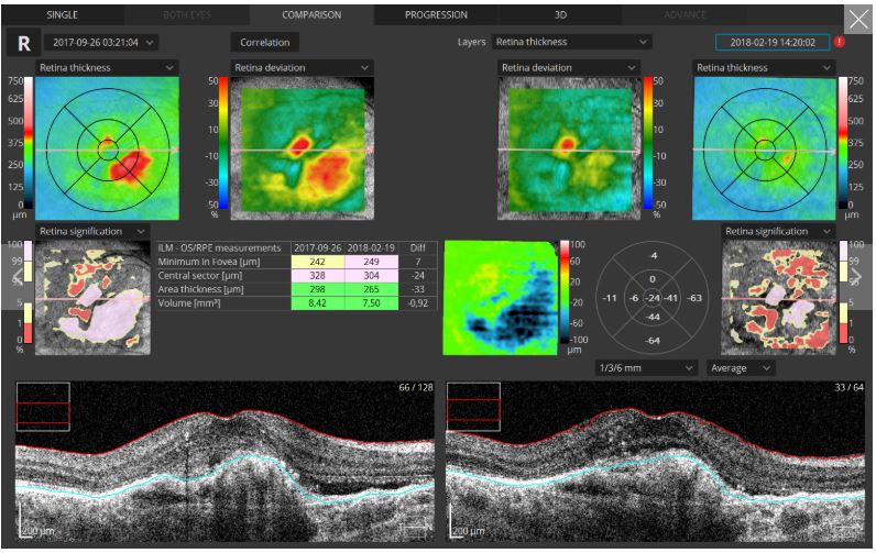 Udoskonalone obrazowanie naczyniówki i ciała szklistego ułatwia szczegółową ocenę stanu struktur poniżej i powyżej siatkówki. Dzięki narzędziu do pomiaru odległości można w łatwy sposób ocenić grubość naczyniówki. Obrazowanie naczyniówki, a także najdrobniejszych szczegółów ciała szklistego zostało poprawione dzięki zaawansowanym trybom skanowania.