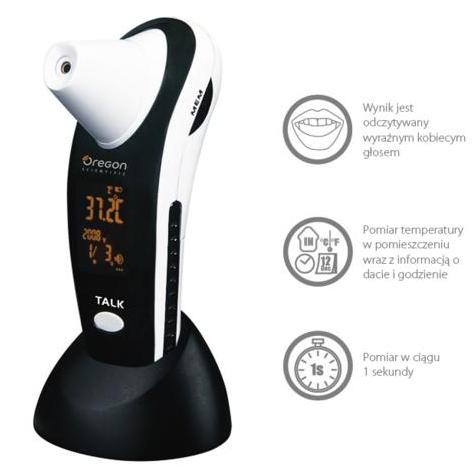 Wielofunkcyjny termometr elektroniczny Oregon ITH 80085 jest urządzeniem medycznym, wykorzystującym najnowszą technologię podczerwieni do pomiaru zarówno temperatury ciała, jak i otoczenia oraz płynów np. mleka dla dziecka w butelce. Bardzo dokładny, szybki, jest zawsze gotowy do użycia, a dzięki funkcji odczytu temperatury ciała głosem w języku polskim może być z powodzeniem używany przez osoby niewidome i niedowidzące. Produkt spełnia europejskie normy bezpieczeństwa.