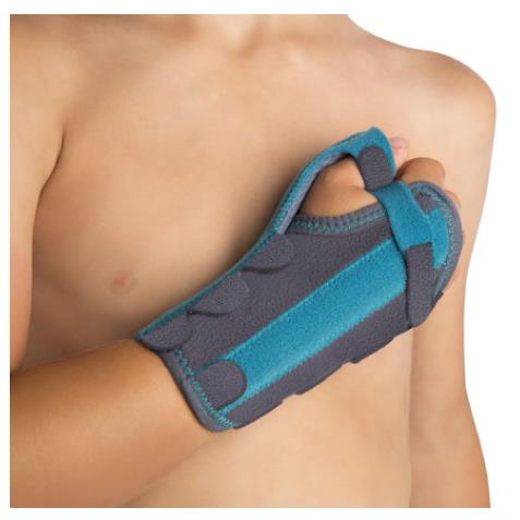 Dziecięca orteza nadgarstka wykonana jest z oddychającego materiału o strukturze plastra miodu wyłożonego od zewnętrznej strony materiałem typu velur, orteza jest zaopatrzona w aluminiowy sztywnik dłoniowy, który w razie potrzeby może być łatwo indywidualnie dopasowany do budowy anatomicznej ręki pacjenta oraz zaleceń terapeutycznych pozycjonowania dłoni, co pozwala na właściwe unieruchomienie stawu nadgarstkowego.