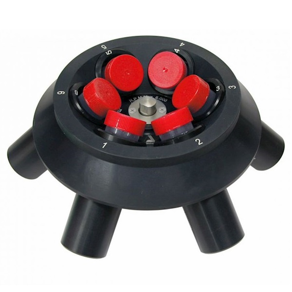 Rotor kątowy RT 121 na 6 x 50 ml Falcon z możliwością wirowania probówek o różnych pojemnościach w zależności od adapterów (opcja), max.RPM 6000, max.RCF 5313.