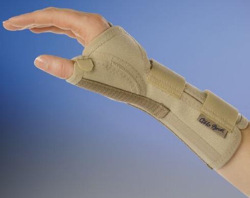 Działanie: zapewnia doskonałą stabilizację nadgarstka dzięki dłoniowej szynie wykonanej z tworzywa sztucznego; bocznie umieszczona fiszbina stabilizuje kciuk.