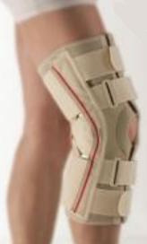Aparat na goleń i udo z szynami bocznymi i regulacją kąta zgięcia i wyprostu. Zginanie: 0°, 10°, 20°, 30°, 45°, 60°,75°, 90°. Prostowanie:0°, 10°, 20°, 30°, 45°. Porażenia i niedowłady kończyny dolnej pochodzenia neurologicznego. Osteoartroza z dużym stopniem niestabilności i naderwaniem więzadeł pobocznych i krzyżowych. Po zabiegach artroskopii stawu kolanowego. Model otwarty. Materiał: ComforTemp (PCM). Rozmiar: XS-XL. Zastosowanie: osteoartroza (choroba zwyrodnieniowa stawów) z dużym stopniem niestabilności i naderwaniem więzadeł pobocznych i krzyżowych; po operacjach i zabiegach artroskopii stawu kolanowego; ból w stawie rzepkowoudowym; porażenia i niedowłady kończyny dolnej. Działanie: stabilizacja boczna dzięki policentrycznym szynom wzmacniającym; regulacja kąta zgięcia i wyprostu w stawie kolanowym; odciąża i stabilizuje staw kolanowy; wzmacniające taśmy Velcro na udzie i łydce zapewniają optymalne dopasowanie i komfort noszenia. Cechy produktu: elastyczna, wykonana z materiału PCM; anatomiczny kształt z miękkimi obrzeżami zapewnia doskonałe przyleganie w miejscu nałożenia i wysoki komfort noszenia; szyny boczne z osłoniętym przegubem, zapewniają dobrą stabilizację oraz zapobiegają rolowaniu się brzegów ortezy; nowatorski system „Click 2 Go” pozwalający na regulację zakresu ruchu bez użycia narzędzi. Możliwość wyjmowania szyn np. w celu czyszczenia ortezy. Skrzyżowane paski w dole podkolanowym zabezpieczające przeprost.