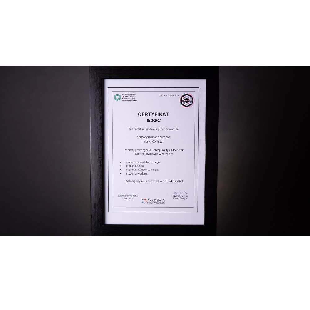 Komory OXYstar posiadają certyfikat Międzynarodowego Stowarzyszenia Normobarii potwierdzający spełnienie wszystkich wymagań sformułowanych w Dobrej Praktyce Normobarycznej odnośnie ciśnienia atmosferycznego oraz stężeń tlenu, dwutlenku węgla i wodoru. Korzystając z nich można więc być pewnym, że warunki panujące wewnątrz są zgodne z założeniami opracowanymi przez twórcę normobarii - Doktora Jana Pokrywkę.