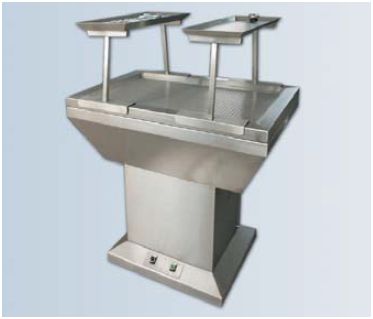 Stół pomocniczy do selekcjonowania narządów. Wyposażony w system wentylacji usuwający odory i szkodliwe opary z powierzchni roboczej. Może być podłączony do centralnej wentylacji lub opcjonalnej stacji wentylacji. Blat roboczy perforowany podnoszony na zawiasach umożliwiający łatwy dostęp do wanny stołu. System podnoszenia i opuszczania z wodoopornymi przyciskami nożnymi umieszczonymi po obydwu stronach stołu. Duża stabilność. Dzięki centralnej nodze łatwy dostęp do pola pracy.