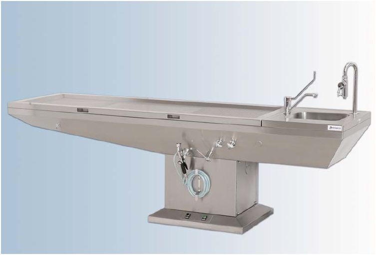 Stół sekcyjny wentylowany z regulacją wysokości. Nowoczesne rozwiązanie konstrukcyjne zrealizowane przy użyciu stali kwasoodpornej INOX 316 L. System wentylacji wymuszonej pozwalający na ściąganie odorów i szkodliwych oparów znad powierzchni stołu. Blat roboczy głęboko tłoczony, perforowany ze zlewem na końcu. Wanna wewnętrzna wyposażona w 2 kanały wentylacyjne, rampę wodną automatycznie zmywającą blat wewnętrzny, system odprowadzenia nieczystości. Centralna noga z pokrywą osłaniającą pozwalającą na wymiane filtra węglowego i dostęp do instalacji. Armatura: natrysk na giętkim wężu o długości 3 m, bateria mieszalnikowa woda-ciepła/woda-zimna regulowana za pomocą łokcia, hydro-aspirator. Uruchamianie wentylacji za pomocą przełącznika pneumatycznego.