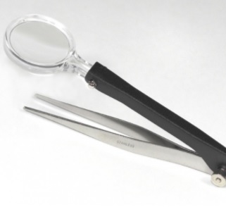 Profesjonalna, punktowa pęseta z lupą przeznaczona jest do precyzyjnych prac podczas depilacji brwi, wyciągania drzag oraz do innych bardzo dokładnych prac. Przy pomocy ośmiokrotnie powiększającej lupy można również zaobserwować zmiany na skórze i płytce paznokciowej. Wykonana jest z wysokiej jakości stali nierdzewnej. Można ją dezynfekować. Długość pęsety z lupą wynosi 13 cm. Średnica szkła powiększającego 3 cm. Zarówno pęseta jaki i lupa ma możliwość regulacji.