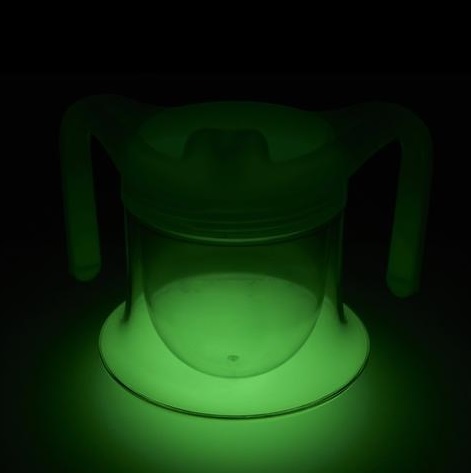 Kubek świecący w ciemności posiada fluorescencyjną bazę świetlną, która może pomóc w znalezieniu go w nocy nie włączając światła. Mimo podświetlenia istnieje duża możliwość trącenia kubka ręką lub nogą i rozlania płynu. Specjalnie zaprojektowany kształt dna zapobiega takiemu scenariuszowi. Kubek wyposażony jest w dwa ergonomiczne uchwyty zapewniające dobry chwyt oraz pokrywkę z dziubkiem ułatwiającą picie.