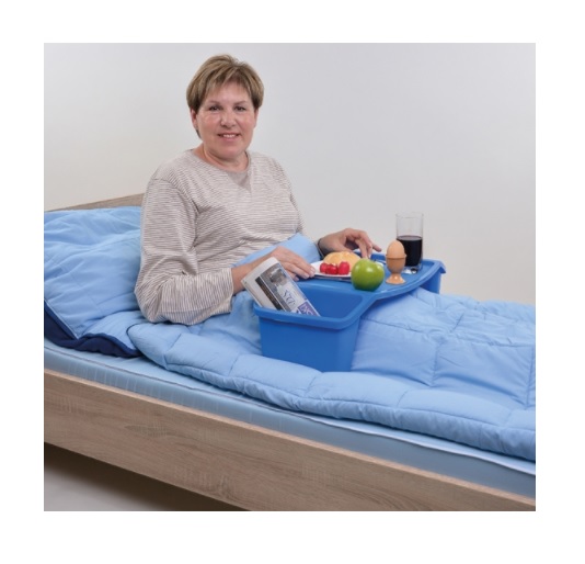 Dzięki stolikowi można na łóżku w bezpieczny i wygodny sposób jeść, pisać, czytać itd. W bocznych przegródkach znajdziemy miejsce na książkę, czasopismo czy okulary. Wymodelowane uchwyty ułatwiają przenoszenie i przestawianie stolika.