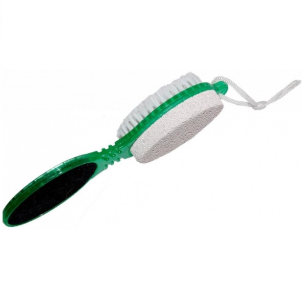 Tarka 4w1 pedicure to kompletny zestaw narzędzi do pielęgnacji stóp. Posiada ostrą metalową tarkę do ścierania zrogowaciałej skóry na piętach, pumeks, klasyczną tarkę typu „papier ścierny” i szczoteczkę, którą domyjemy nie tylko pięty, ale również paznokcie dłoni. Całkowita długość 17 cm.