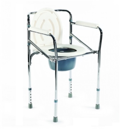 Krzesło toaletowe składane wykonane z stalowej, chromowanej ramy. Posiada regulowane na wysokość nóżki zakończone gumowymi nasadkami. Wyposażone dodatkowo w deskę sanitarną z klapą oraz pojemnik sanitarny. Łatwe składanie i regulacja pozwala na dostosowanie do potrzeb pacjenta, a boczne uchwyty wspomagają stabilność i bezpieczeństwo użytkowania.