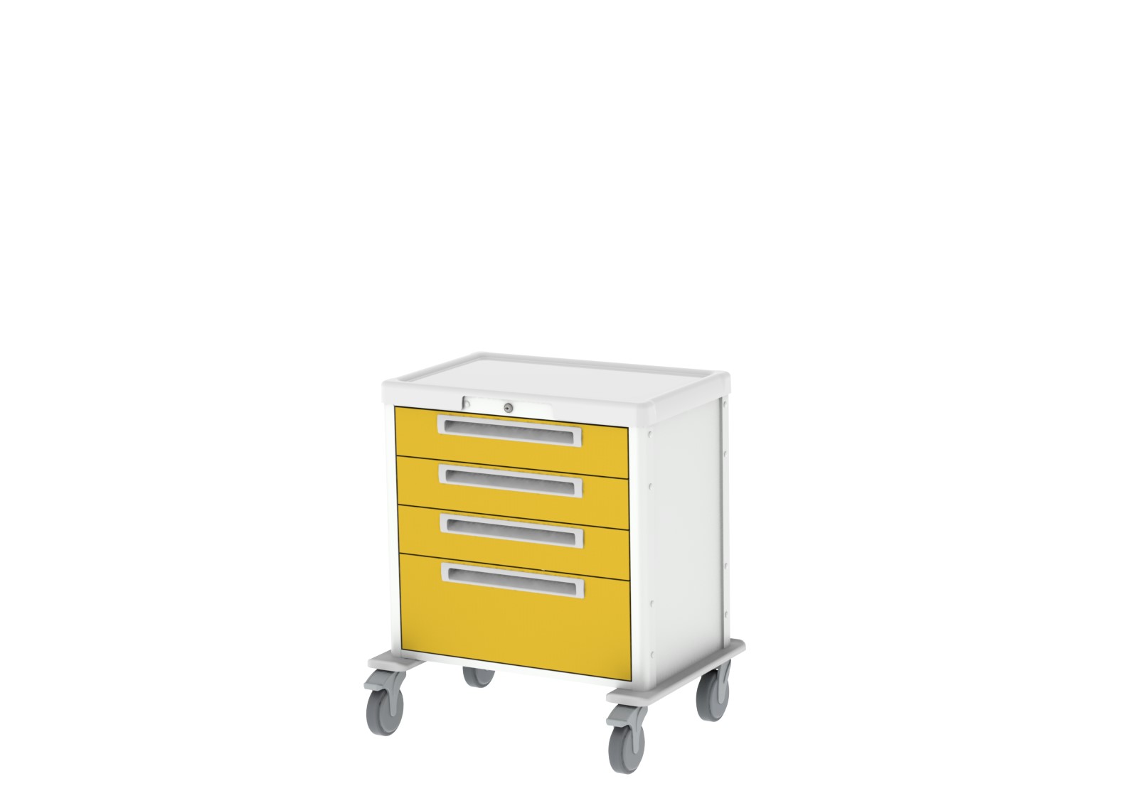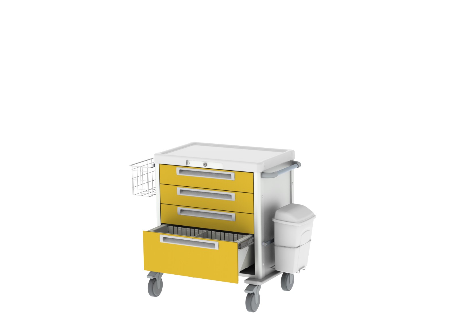 Plus - Wózek ma zazwyczaj 4-5 szuflad i jest wyposażony w: zamek na klucz, blat roboczy, uchwyt do pchania, kosz na śmieci wraz ze wspornikiem szyny DIN i pojemnikiem na odpady. Wózek można szybko i łatwo zdezynfekować przy użyciu standardowych protokołów i środków dezynfekujących.