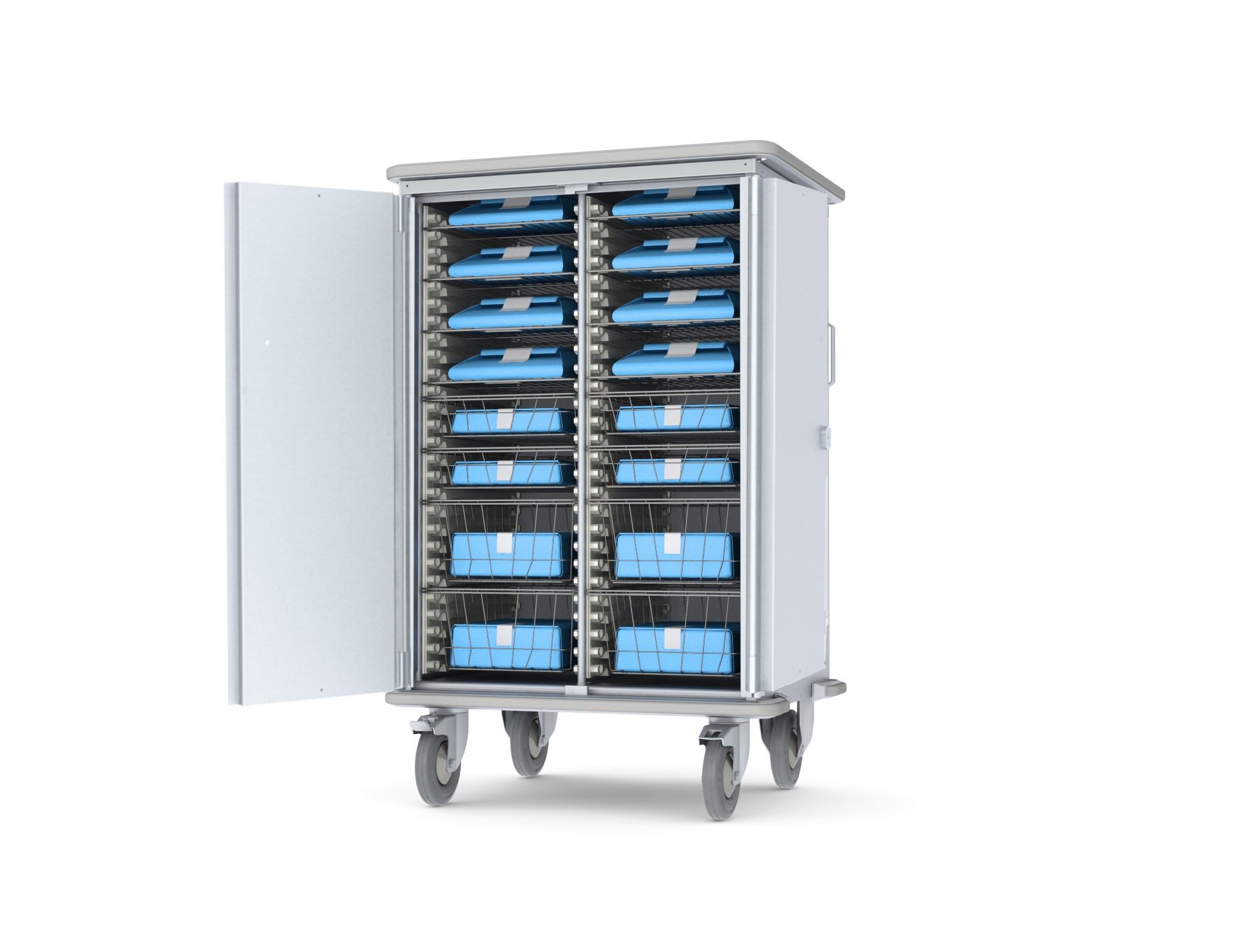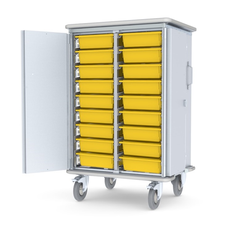 Wózki Hermes o wytrzymałej konstrukcji aluminiowej przeznaczone są głównie do transportu sterylnego i niesterylnego sprzętu medycznego między centralną sterylizatornią a oddziałami przyjmującymi.