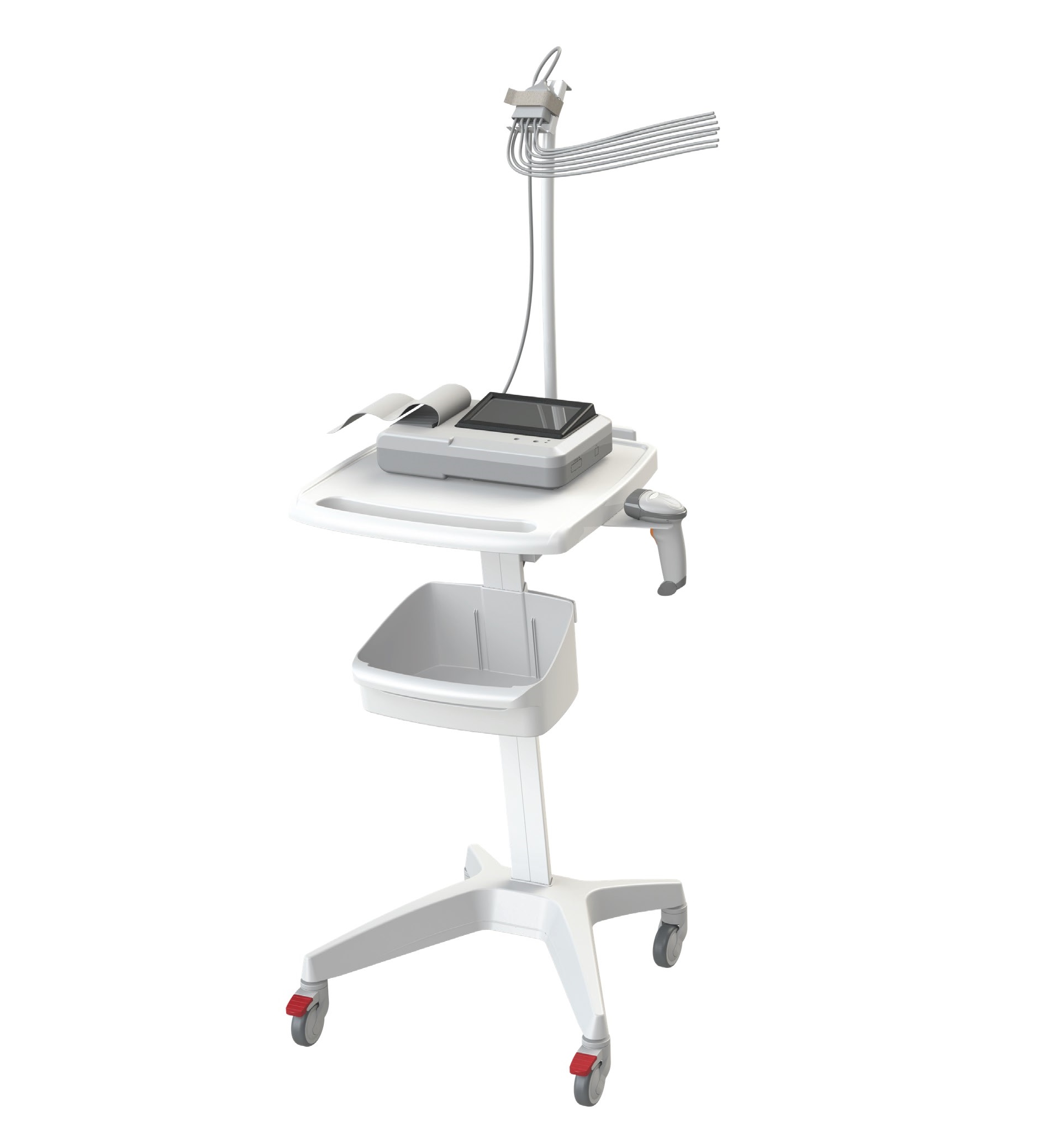 Wózek EKG z elastycznym ramieniem prowadzącym, umożliwiający wygodny i łatwy dostęp do pacjenta. Wózek wyposażony jest w blat roboczy, uchwyt do pchania, gniazdo zasilania oraz uchwyt na czytnik kodów kreskowych