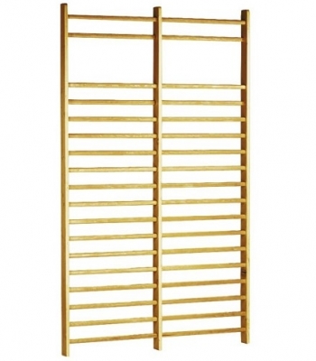 Drabinka gimnastyczna podwójna wykonana jest z drewna, malowana lakierem bezbarwnym, mocowana do ściany. Boki wykonane z drewna iglastego lub liściastego. Szczeble z litego drewna.