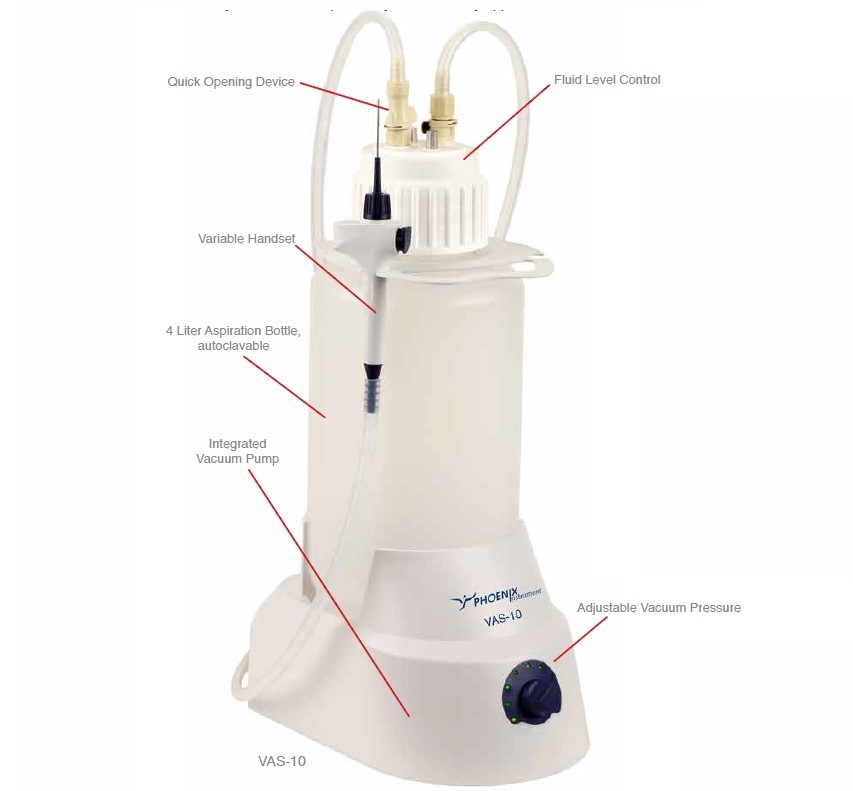 Nowy system zasysania próżniowego VAS-10 jest idealny do zasysania cieczy ze wszystkich rodzajów naczyń. 4-litrowa Butelka aspiracyjna jest autoklawowalna i można ją łatwo wyjąć z systemu za pomocą urządzenia do szybkiego otwierania. Zintegrowana kontrola poziomu płynu zapobiega nadmiernemu napełnieniu butelki. Maksymalne ciśnienie próżni 600 mbar można dowolnie regulować, dostosowując system do wielu zastosowań.