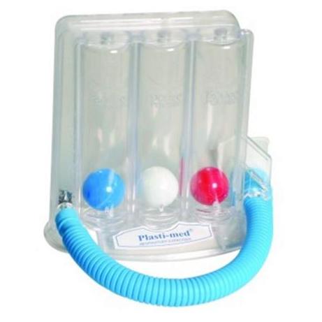 Przyrząd do ćwiczenia wdechu (podnoszenie kuleczek podczas wciągania powietrza). Po odwróceniu przyrządu o 180º (podstawką do góry) można ćwiczyć wydech. 3 komorowy zestaw do treningu oddechu.