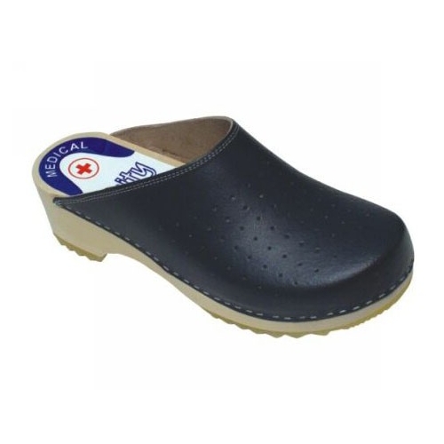 Lekkie spody drewniane z profilem ortopedycznym. Podeszwa gumowa przeciwpoślizgowa. Cholewka skórzana. Posiada atesty Instytutu Przemysłu Skórzanego dopuszczające do stosowania w placówkach Służby Zdrowia oraz Deklarację Zgodności z normami europejskimi.