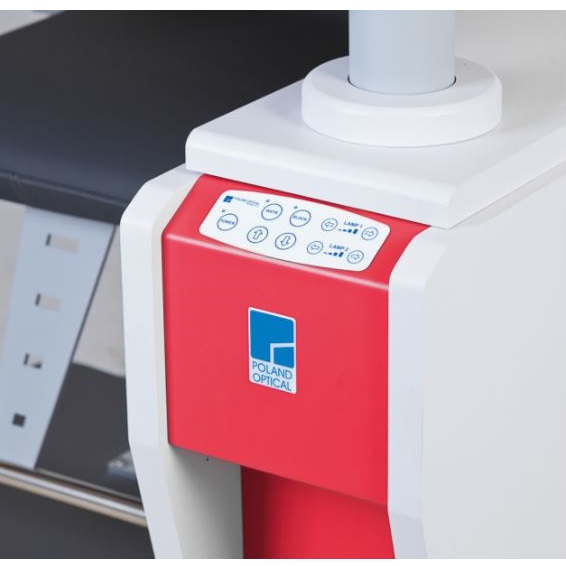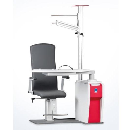 Fotel wyposażony jest w wysokiej jakości siłownik szwajcarskiej firmy Schumo, podnóżek oraz podłokietniki (opcja). Siedzenie fotela jest obite skajem w dowolnym kolorze ze wzornika.Nieprzesuwny blat unitu jest wyposażony w gniazdo niskonapięciowe 6 V do zasilania lampy szczelinowej oraz gniazdo zasilające o napięciu 230 V i ma możliwość blokowania w dowolnym miejscu. Ponadto na unicie mocowane jest oświetlenie w postaci lampki halogenowej z opcją regulacji natężenia światła oraz opcjonalnie: balansowe ramię foroptera. Unit obsługuje się w wygodny i łatwy sposób z podręcznego panelu sterowania. Zapraszamy także do zapoznania się z innymi oferowanymi przez nas meblami okulistycznymi.