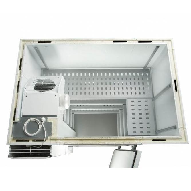 Do utrzymania zadanej temperatury w komorze chłodniczej wykorzystuje się niezależny agregat chłodniczy typu monoblok ze skraplaczem powietrznym, wbudowany do komory chłodniczej. Zastosowany czynnik chłodniczy R404a. Agregat chłodniczy składa się ze sprężarki, skraplacza powietrznego z wentylatorem, parownika/chłodnicy powietrza z wentylatorem, automatyki chłodniczej i sterującej. Odszranianie chodnicy powietrza gorącymi parami czynnika chłodniczego. System odprowadzania skroplin zamknięty działający na zasadzie odparowania wody.