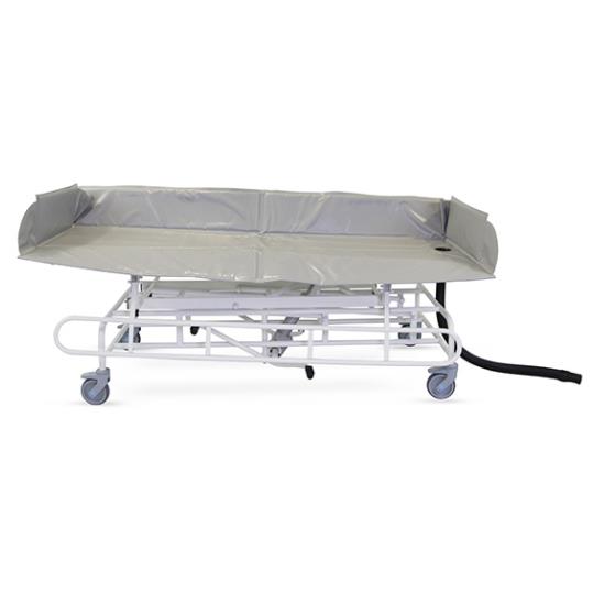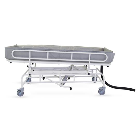 Wózek prysznicowy z regulowaną wysokością za pomocą pompy hydraulicznej, z rurą odpływową i wyścielaną wkładką.