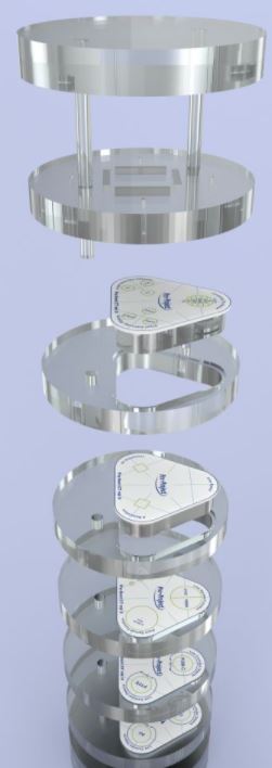 Fantom składa się z głównego cylindra PMMA, który mieści w sobie moduły z różnymi obiektami testowymi. Dzięki takiemu projektowi możesz przeprowadzać testy na urządzeniach o małym FOV w różnych pozycjach w fantomie 160mm.