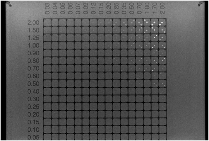 Fantom do testowania szczegółowości kontrastu aparatów mammograficznych zgodnie z Europejskimi wytycznymi odnośnie Zapewniania Jakości w mammografii (“European Guidelines for Quality Assurance in Mammography Screening”), rozporządzeniem Ministra Zdrowia, polską normą PN-EN 61223-3-2 oraz wymaganiami NFZ. Pozwala na stwierdzenie czy aparat mammograficzny pozwala na zobrazowanie obiektów o bardzo niskim kontraście i średnicy, ustalić optymalną technikę ekspozycji lub porównać jakość obrazu dla różnych grubości obiektów przy różnej grubości PMMA.
