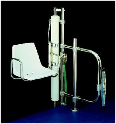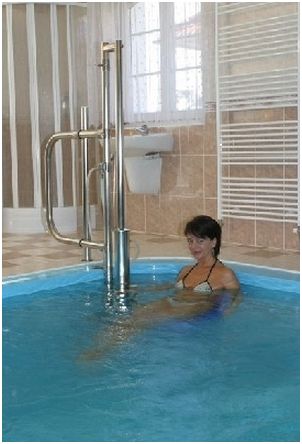 Podnośnik basenowy DELFIN stworzony został z myślą o osobach niepełnosprawnych, które pragną korzystać z basenu. Jest to stabilne siedzisko z oparciem, które potrafi zjechać z osobą do basenu a następnie unieść ją z powrotem na brzeg. Podnośnik napędzany jest za pomocą ciśnienia wody z instalacji wodnej budynku. Urządzenie montowane jest do podłoża oraz ściany basenu. Podnośnik wykonany ze stali nierdzewnej.