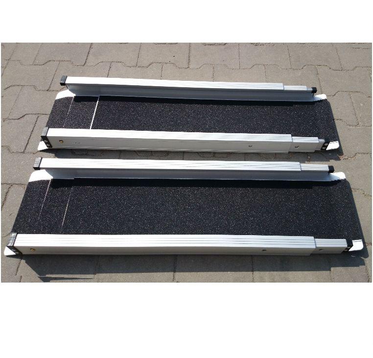 Rampy podjazdowe GA to przenośne rozwiązanie przy pokonywaniu barier architektonicznych. Stanowią pomocniczy sprzęt dla przetransportowania wózków inwalidzkich - służą do łączenia powierzchni znajdujących się na różnych poziomach. Idealne do przewożenia w samochodzie dzięki niewielkim wymiarom. W komplecie szyny oraz pokrowiec.
