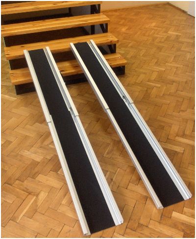 Szyny najazdowe R-LA to przenośne rozwiązanie do likwidacji barier architektonicznych. Przeznaczone są do przemieszczania po nich wózków inwalidzkich. Szyny teleskopowe służą do łączenia powierzchni znajdujących się na różnych poziomach. Mogą być wykorzystywane między innymi przy najeżdżaniu na schody i transportowaniu wózka do samochodu. Przy transporcie szyna wsuwana w szynę pozwala na oszczędność miejsca. Charakteryzują się bardzo małą wagą i posiadają rączki do przenoszenia. Rozwiązują problem schodów, które mają maksymalnie do 5 stopni. Szyny wyposażone w futerał do przechowywania.