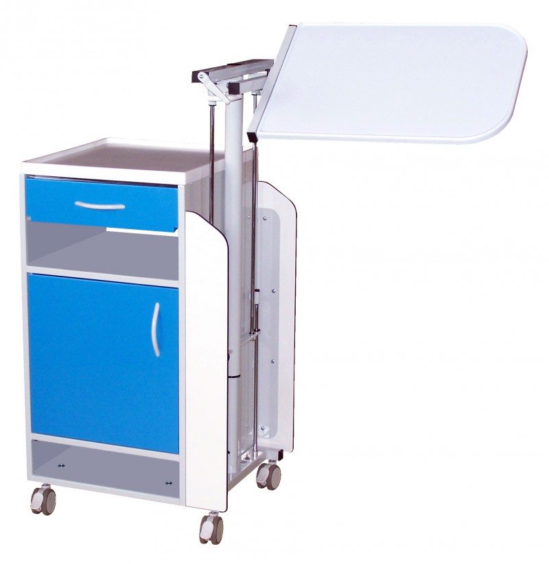 Metalowa szafka przyłóżkowa NS-21 przeznaczona jest dla sektora opieki domowej i instytucjonalnej, do łóżek z regulacją wysokości. Blat boczny posiada regulację wysokości za pomocą sprężyny gazowej i obustronne nachylenie.