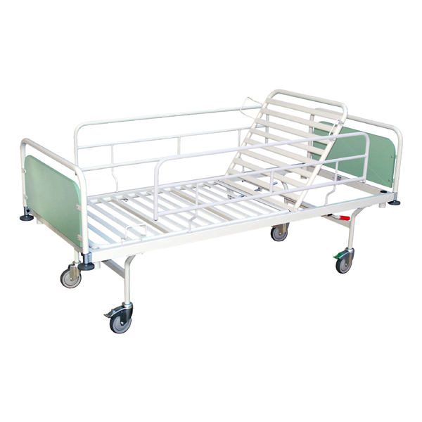 Łóżko o stałej wysokości (510 mm) z regulacją pleców. Kółka odbojowe z tworzywa w rogach łóżka 2x z blokadą, 1x bez, 1x z funkcją. jazdy na wprost. Oparcie nóg bez regulacji. Metalowe barierki są nakładane, przy wezgłowiu znajdują się tuleje do mocowania wyposażenia.