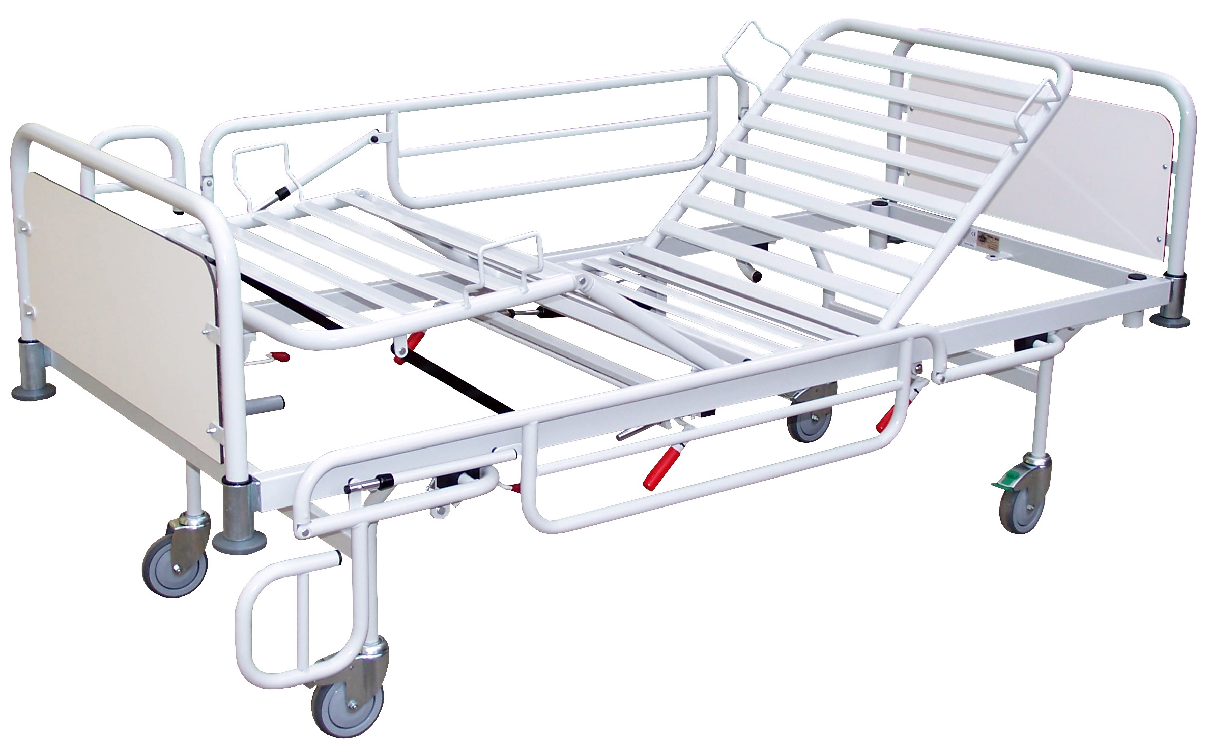 Łóżko o stałej wysokości (510 mm) z regulacją pleców i nóg. Kółka odbojowe z tworzywa w rogach łóżka 2x z blokadą, 1x bez, 1x z funkcją. jazdy na wprost. Trendelenburg (16°) regulowany jest mechanicznie, a oparcie podudzi mechanizmem zapadkowym. Metalowe barierki są składane, przy wezgłowiu znajdują się tuleje do mocowania wyposażenia.