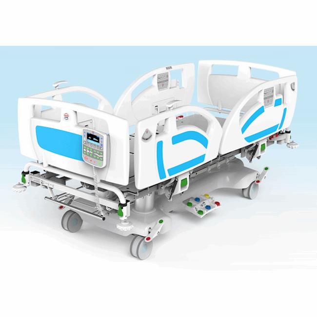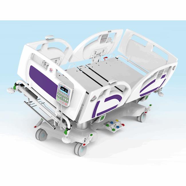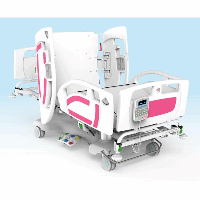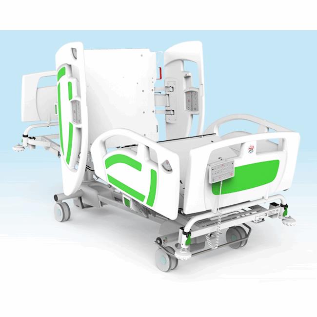 - MAKSYMALNE BEZPIECZEŃSTWO – Ochrona przed zakleszczeniem poszczególnych części ciała pacjenta oraz pełna eliminacja miejsc niebezpiecznych w zasięgu ręki pacjenta. Podwyższone barierki boczne chronią pacjenta przed wypadnięciem z łóżka nawet przy zastosowaniu wysokich materacy przeciwodleżynowych.