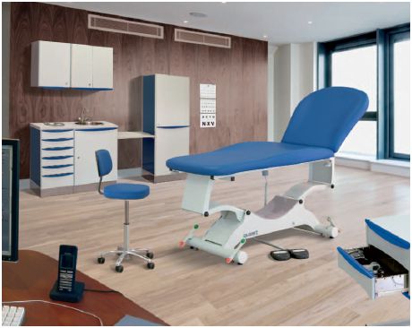 Stół do badań z napędem elektrycznym, maksymalne obciążenie wynosi 200 kg. Regulacja wysokości w zakresie od 46 do 92 cm. Stół wyposażony w uchwyt na ręczniki papierowe. Stoły dostępne z różnymi powierzchniami blatu o szerokościach 65, 73, i 75 cm.