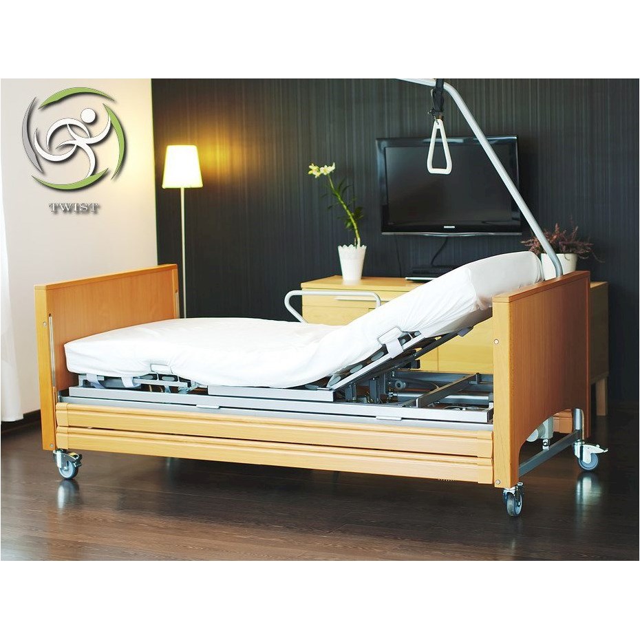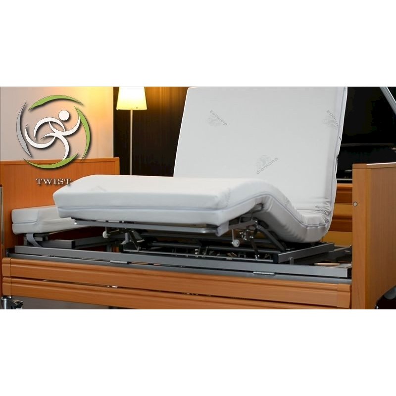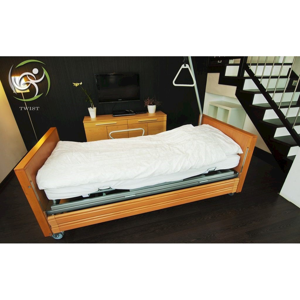 Rehabilitacyjne łóżko obrotowe TWIST przeznaczone jest do mobilizacji osób niepełnosprawnych do wykonywania codziennych czynnościach życiowych, niezwykle przydatne przy próbach wstawania i chodzenia. Łóżko rehabilitacyjne TWIST jest innowacyjne i bardzo zaawansowane, ułatwia siedzenie i wstawanie. Za pomocą pilota można zmienić pozycję leżącą do pozycji fotelowej z opuszczonymi nogami. Możliwa jest także dodatkowa funkcja pionizacji. Dzięki niej uniesienie i przechylenie łóżka w pozycji fotelowej pozwala na przesunięcie środka ciężkości ciała, dzięki czemu uniesienie bioder podczas wstawania jest o wiele łatwiejsze. Wstawanie z łóżka staje się mniejszym problemem. Pozwala to na większą mobilizację chorego do codziennej aktywności ruchowej.