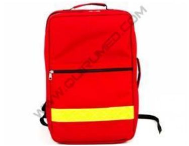 Plecak na sprzęt do tlenoterapii. Wykonany z nylonu; z zamkiem błyskawicznym; sztywna rama; pasy odblaskowe; centralne taśmy do mocowania butli tlenowej; wyjmowane kolorowe kieszenie; wyściełane taśmy naramienne.