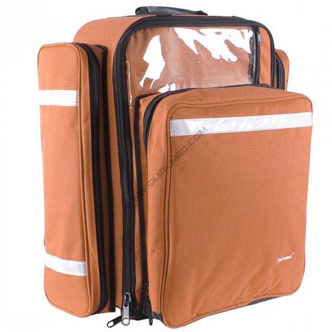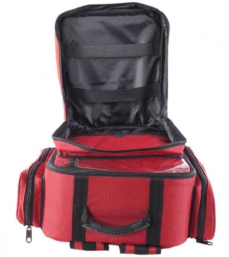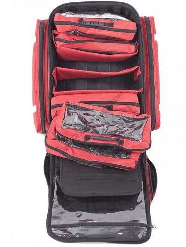 Plecak pierwszej pomocy odblaskowe paski, 5 komór, 5 kieszeni wewnętrznych i wyściełane oparcie z 5 przedziałami i 5 workami do złożenia materiału.
