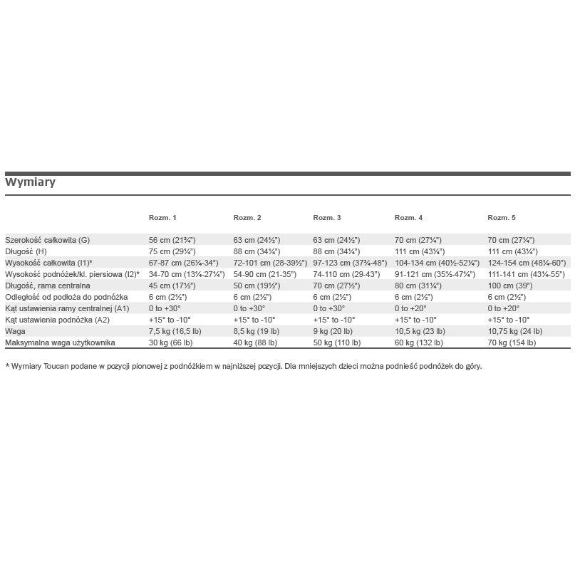 Toucan jest dostępny w 5 rozmiarach i odpowiedni dla dzieci w wieku od 1-18 lat. Nie wszystkie dzieci są takie same – dlatego w celu dobrania odpowiedniego rozmiaru ważne jest, aby skorzystać z tabeli wymiarów.