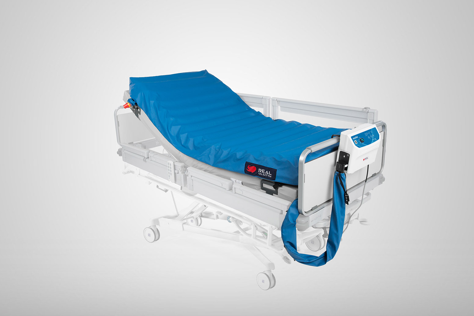 NEODEC® to zmiennociśnieniowy materac przeciwodleżynowy wyposażony w funkcje przechyłów i rotacji bocznej - Easy Turn Technology. W skład kompletnego systemu wchodzą: pompa, materac oraz pokrowiec.
