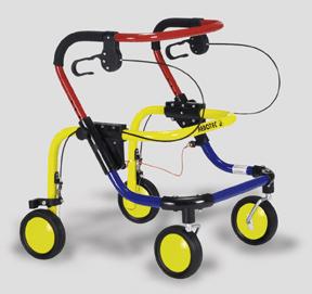 Rolator dziecięcy. Wyposażenie: podwójny hamulec ręczny; składany; pełne koła. Dane Techniczne: szerokość 57,5 cm; wysokość 60,0 - 69,0 cm; waga 5,2 kg; 5 szczebli wysokości; certyfikat Ce dopuszczający masę do 100 kg.