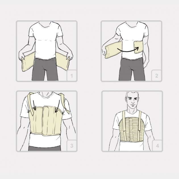 Wysoki męski pas żebrowy AM-PZM-01 został wykonany z ażurowej gumy ortopedycznej. Obejmuje on od gory żebra aż po rękojeść mostka, od dołu zaś wszystkie łuki żebrowe. Wyposażono go w przednie i tylne fiszbiny ortopedyczne, poprawiające stabilizację klatki piersiowej oraz regulowane szelki utrzymujące ortezę na właściwym miejscu. Wyrób posiada przednie zapięcie, co ułatwia pacjentowi samodzielne założenie go. Orteza stabilizuje klatkę piersiową i zmniejsza dolegliwości bólowe.