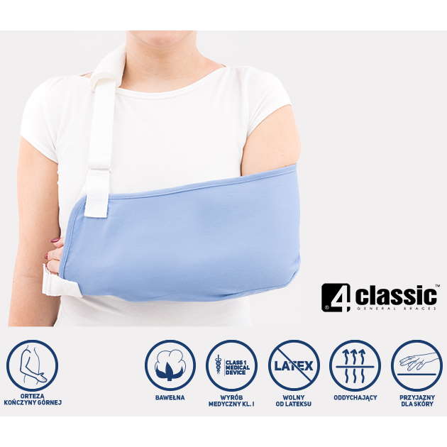 Orteza AM-SOB-03 należy do grupy ortez 4CLASSIC. Zapewnia unieruchomienie oraz podtrzymanie kończyny górnej. Kształt wyrobu oraz podział rozmiarowy umożliwiają idealne dopasowanie do ciała pacjenta. Wyrób posiada funkcję obustronnego noszenia, co pozwala na stosowanie go zarówno na prawe jak i lewe ramię. Układ podtrzymywania kończyny jest mocowany za pomocą regulowanej taśmy naramiennej, umożliwiającej precyzyjne ustawienie kończyny we właściwej wysokości. Szeroki pas podtrzymujący zapewnia równomierne rozłożenie ciężaru na całej długości pleców.