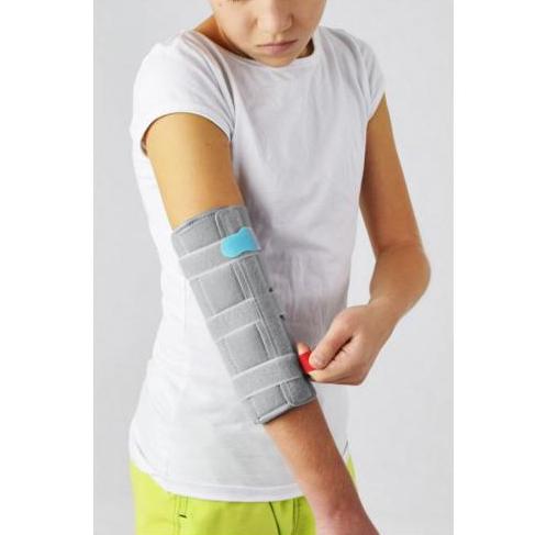 Dziecięcy tutor łokciowy wykonany z lekkiego surowca, wyścielonego przewiewną bawełnianą dzianiną frotte, zapewnia wentylację i odprowadzanie wilgoci z powierzchni skóry. Wyposażony w szyny ortopedyczne doskonale stabilizuje staw łokciowy i jest idealną alternatywą dla ciężkiego opatrunku gipsowego łokcia.