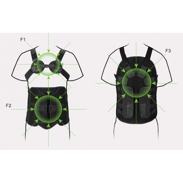 Orteza TLSO tworzy 3-punktowy układ sił, na które składają się skierowane ku tyłowi z powierzchni mostka (F1) i okolic łonowych (F2) oraz siła skierowana ku przodowi z odcinka lędźwiowo-piersiowego kregosłupa (F3). Stworzone w ten sposób ciśnienie wymusza postawę przeprostną, zwiększa lordozę lędźwiową kręgosłupa oraz ogranicza jego ruchy boczne i obrotowe w płaszczyźnie strzałkowej, czołowej i poprzecznej.